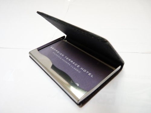 Exterior Leather, Interior Metal. Case is secured shut by the magnetic flap. Business Card Organizer Wallet. It's the perfect gift for men and women.Customer Reviews